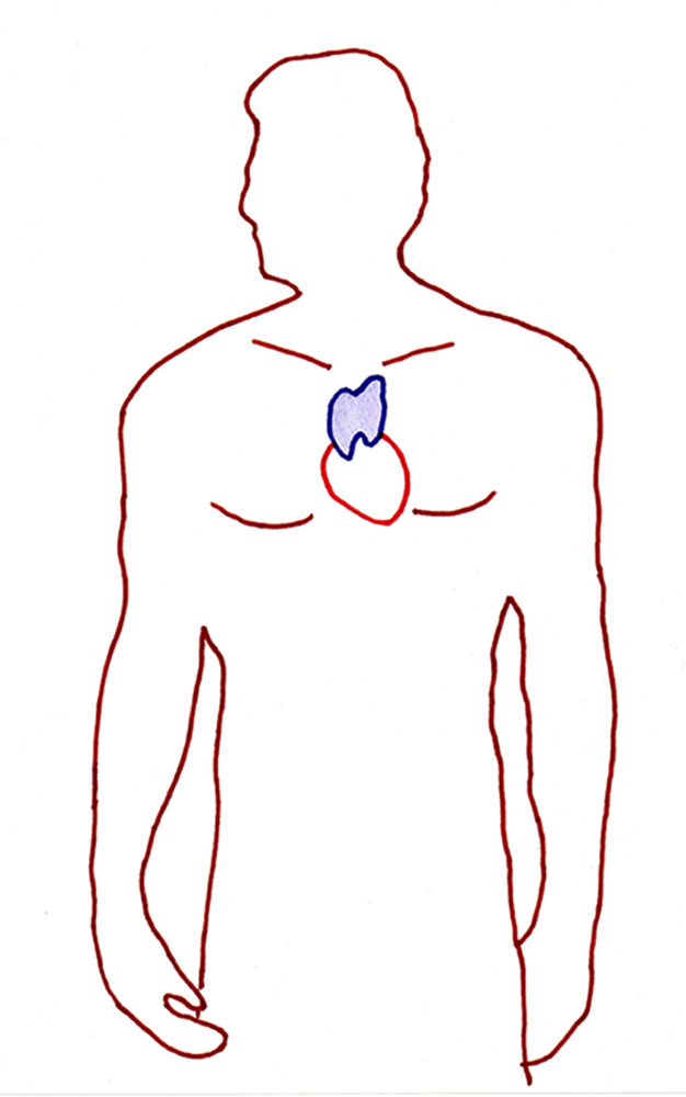 C’est assez simple, avec vos mains suivez vos clavicules jusqu’au milieu de votre thorax, le thymus est placé juste en dessous de ce point. Il est en colorié en bleu sur le schéma.